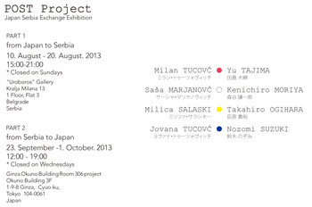 往路展:From Japan To Serbia 2013 年8月10日–8月20日 15:00~21:00 *日曜日休み Uroboros Gallery http://www.uroboros.rs/ ・・・・・ 復路展:From Seriba To Japan 2013 年9月23日–10月1日 12:00〜19:00 *水曜日休み 銀座奥野ビル306号室プロジェクト http://306project.web.fc2.com/index.htm |